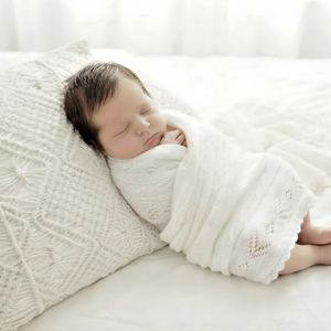 These beautiful wraps are a must-have item and you'll be reaching for them in every newborn session! Medium-weight with a gorgeous floral knit design and pretty scalloped edges, they are perfect to use a loose wrap, layer or amazing drape/long blanket. Add this feature wrap to your studio collections today!