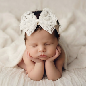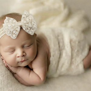 A beautiful oversized lace bow headband suitable for newborn size to 3 years.