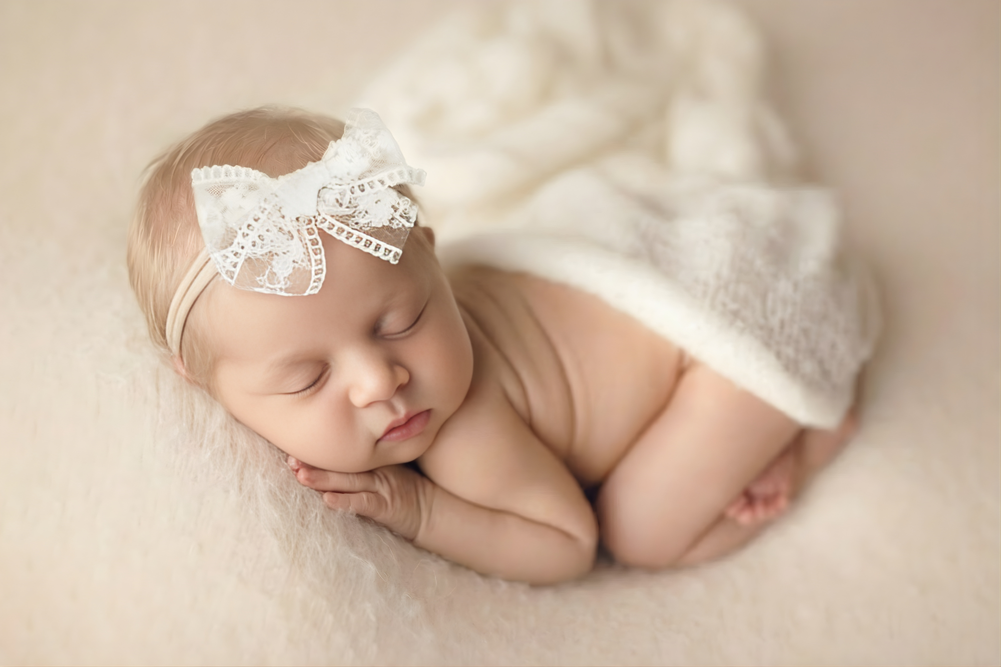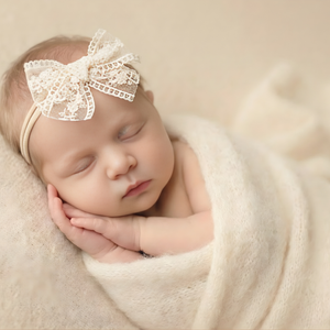 A gorgeous headband featuring pretty floral lace oversized bow with stretchy jersey band at back for perfect fit. To suit newborn - 3 years. Available in three lovely shades.