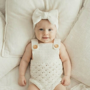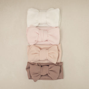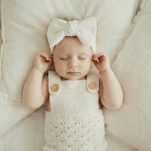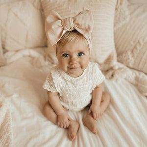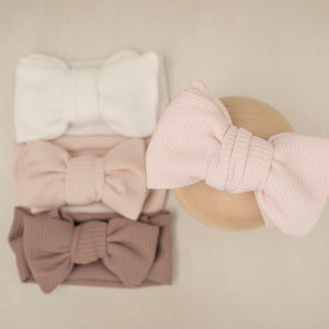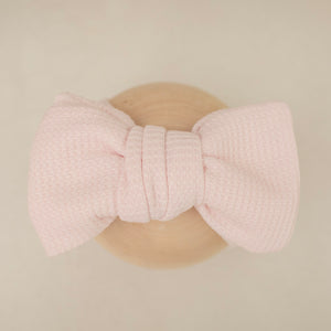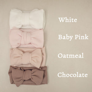 A stunning oversized waffle fabric bow headband suitable for newborn size to 3 years.