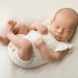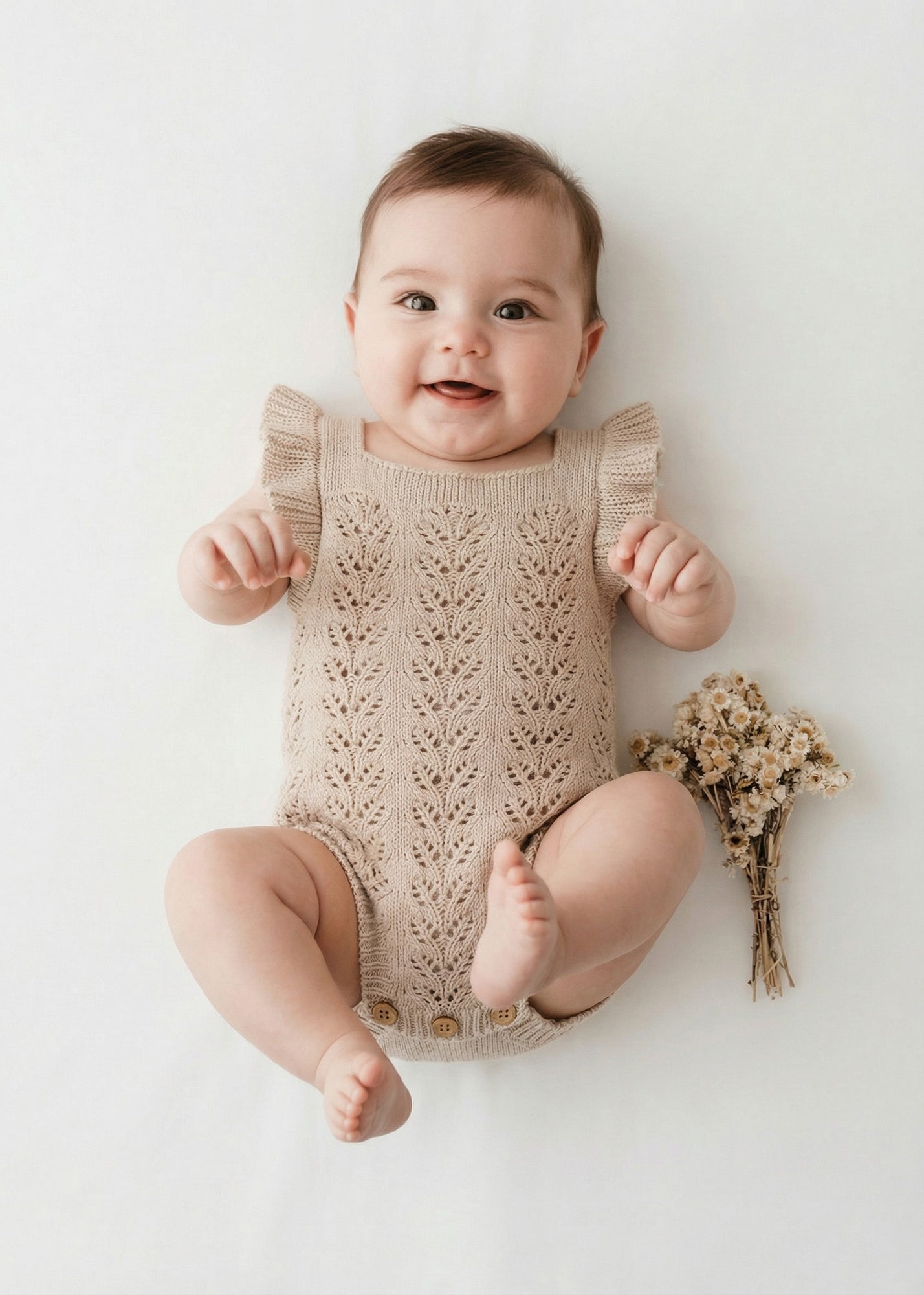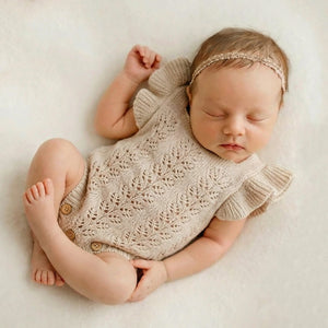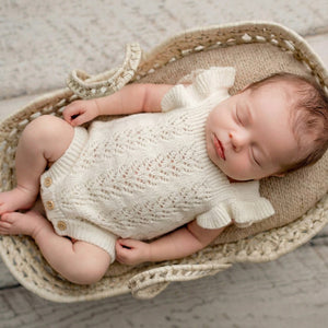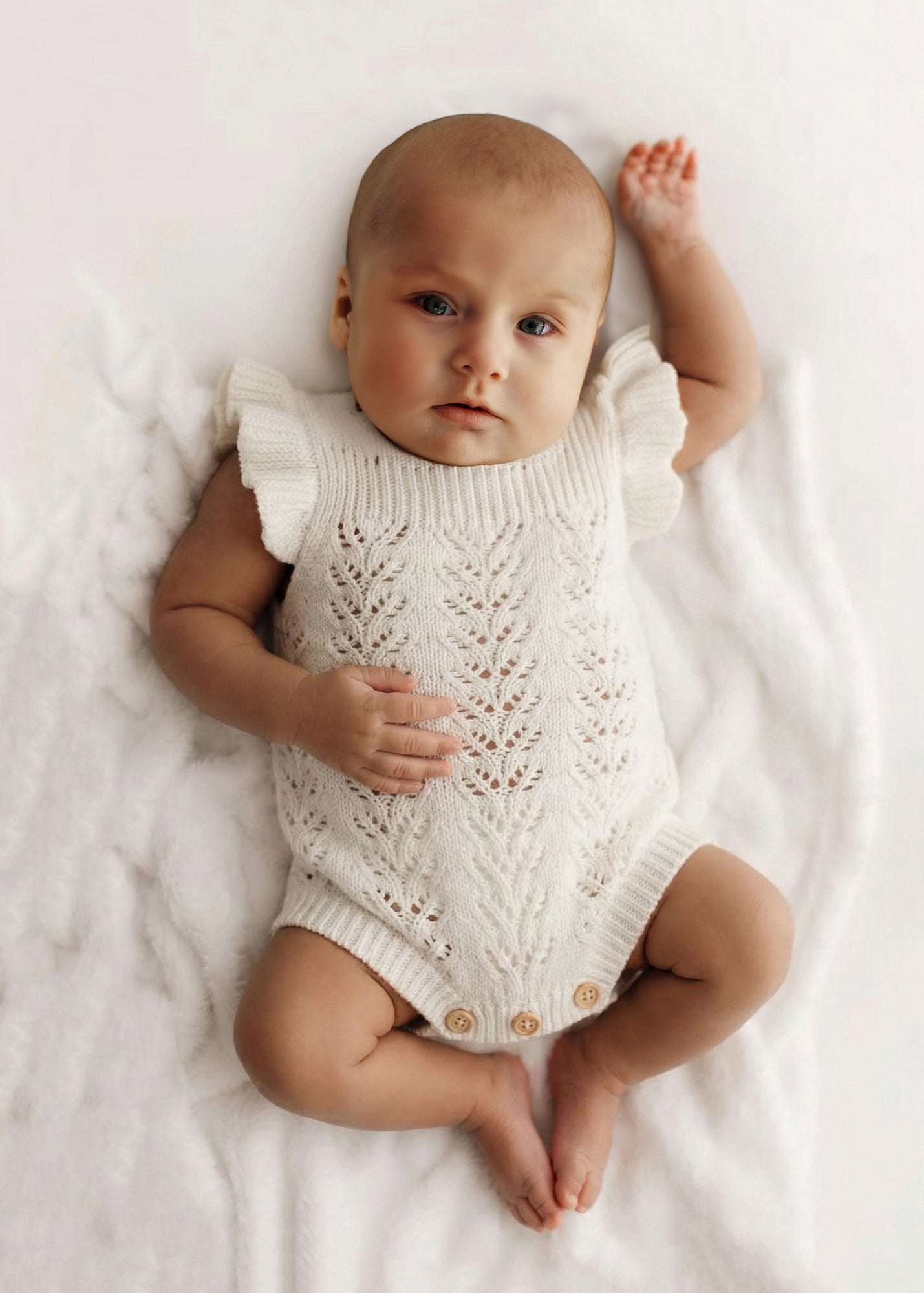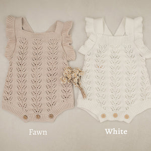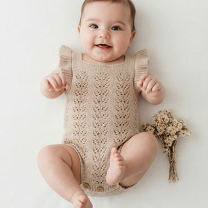 Our stunning Georgie Knit Rompers feature a gorgeous botanical pointelle design with pretty ruffled shoulders that criss-cross at the back. Faux wood buttons at bottom and two sets of adjutable buttons at back for ease of use. Available in two gorgeous shades!